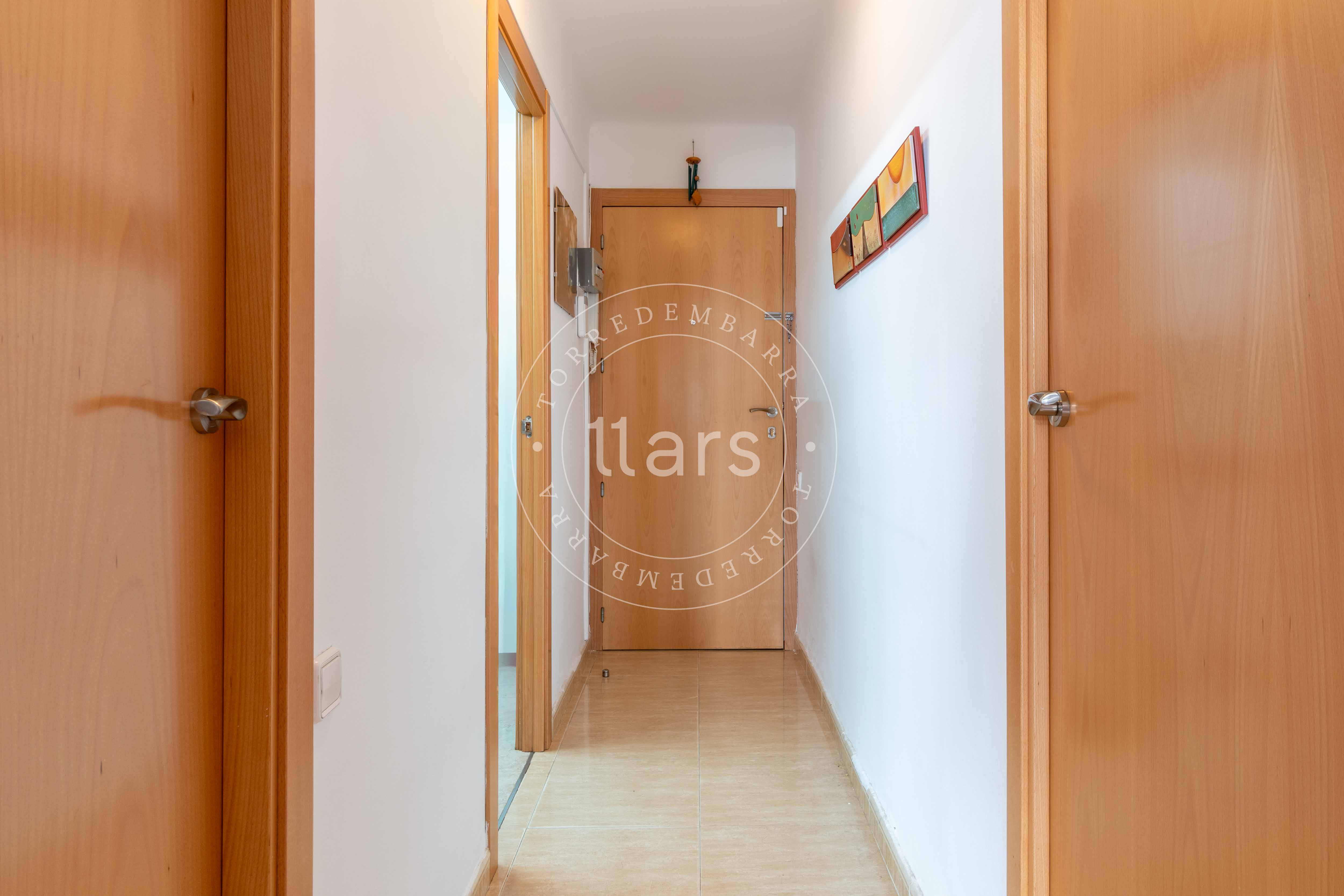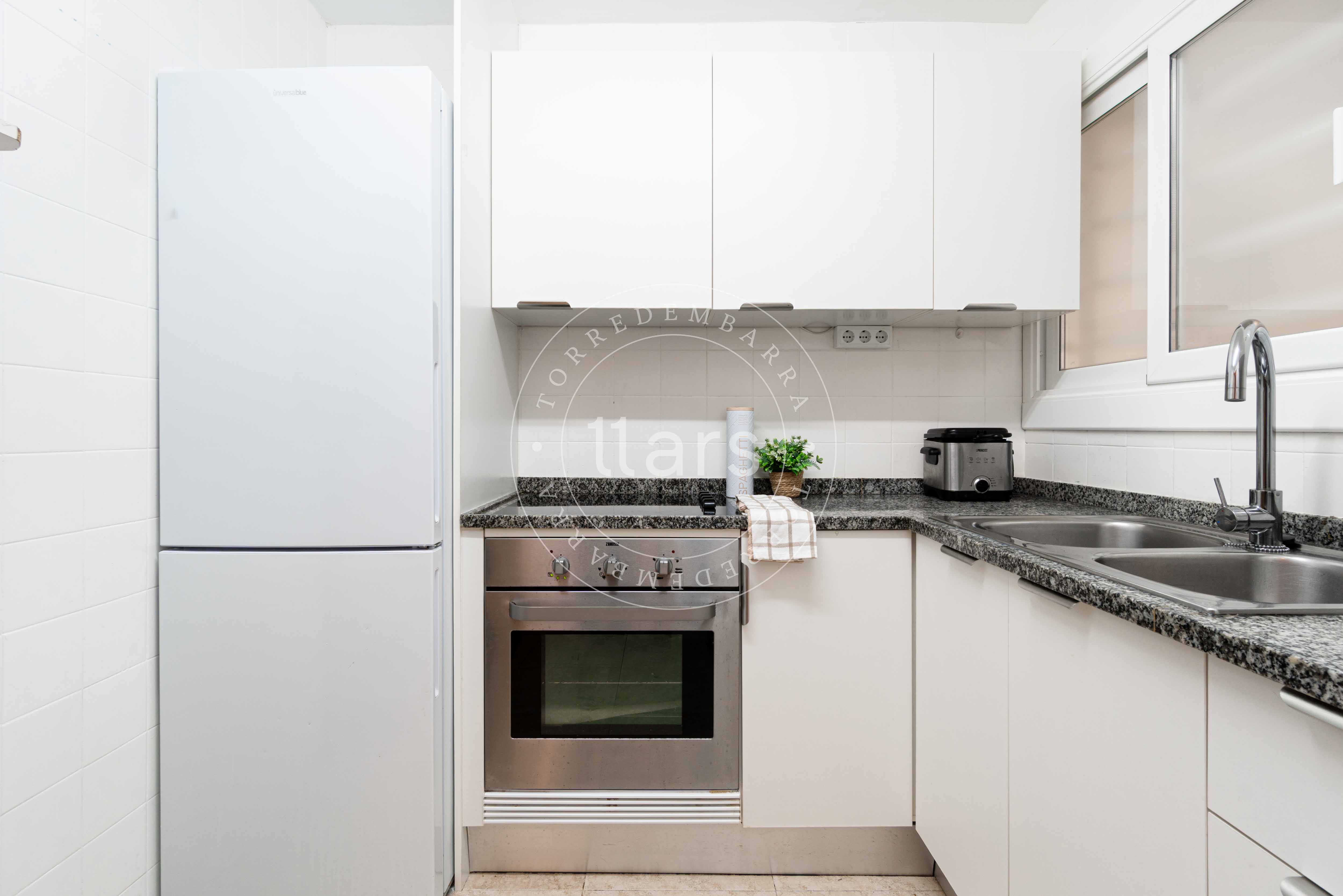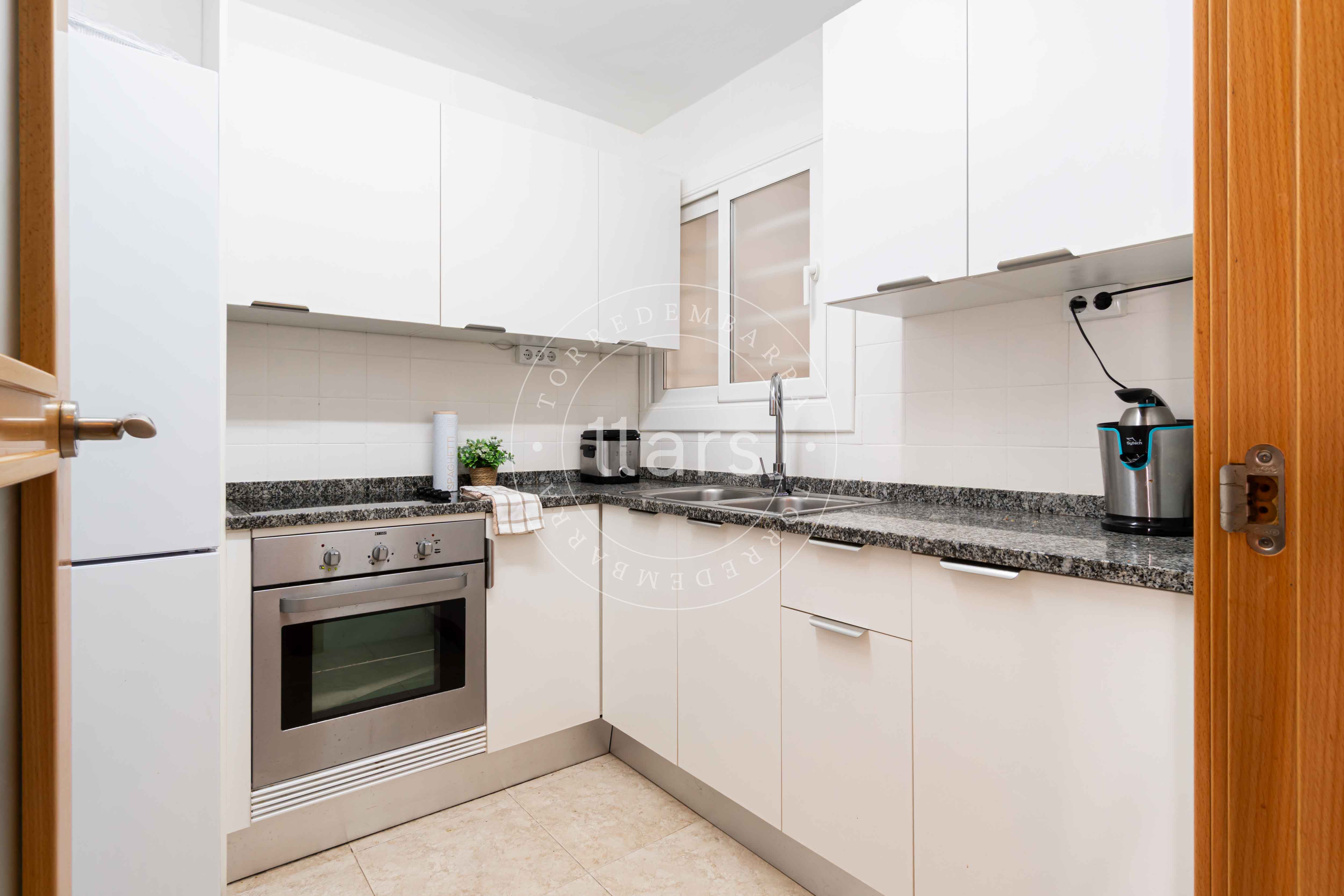 A través de un pasillo encontramos el resto de estancias: una segunda habitación doble con armario empotrado, un baño completo con plato de ducha y una cocina cuadrada totalmente equipada, práctica y funcional para el día a día.