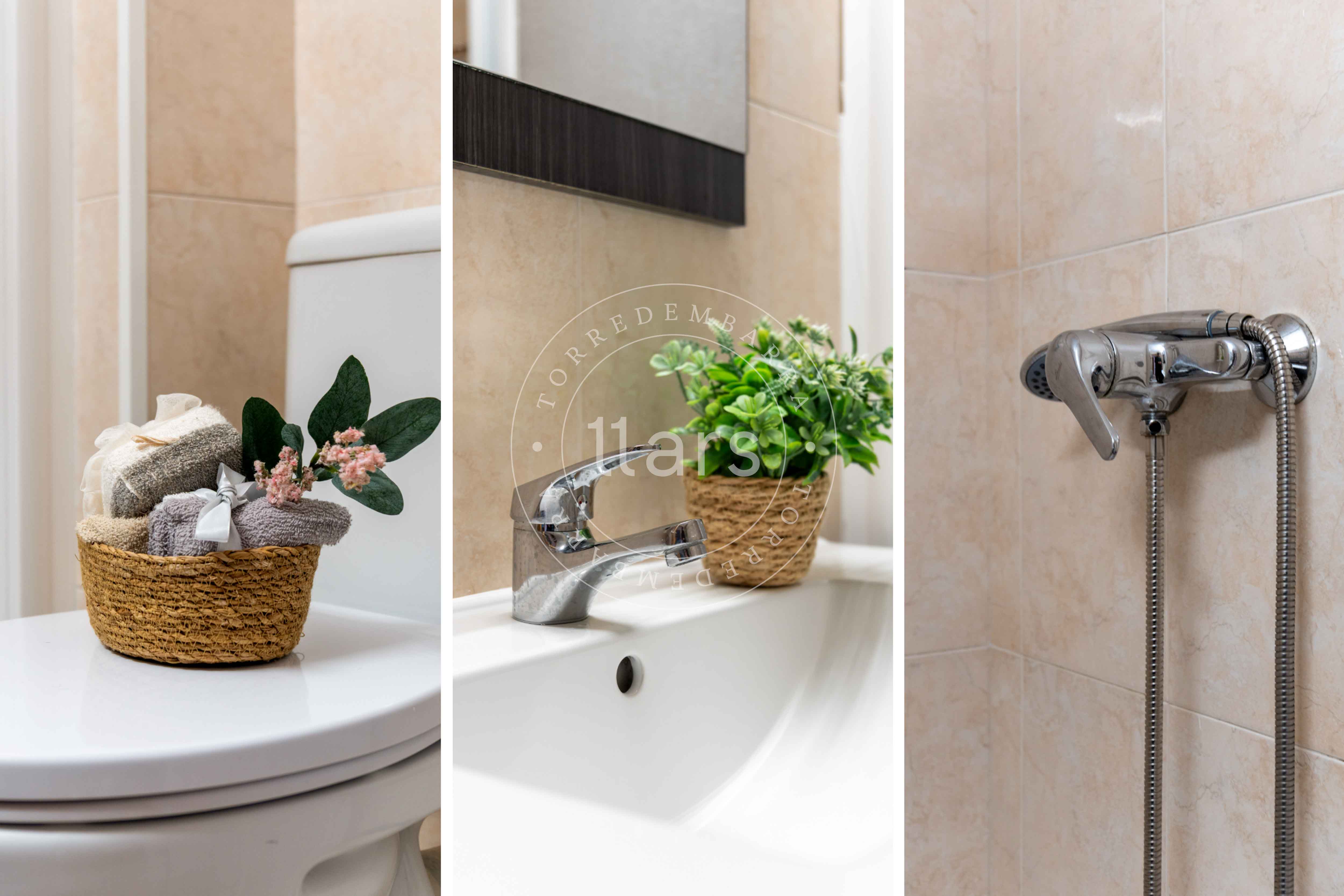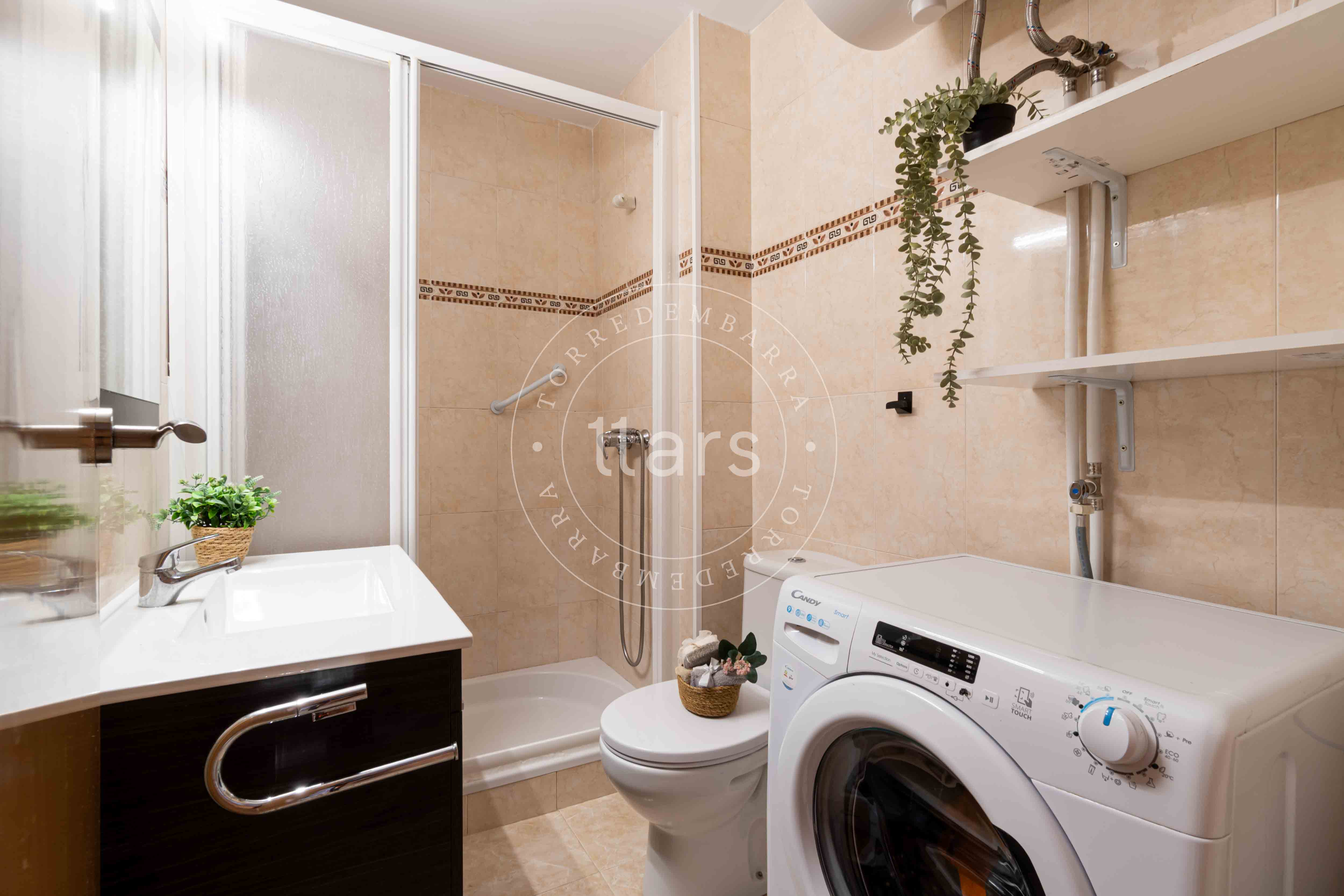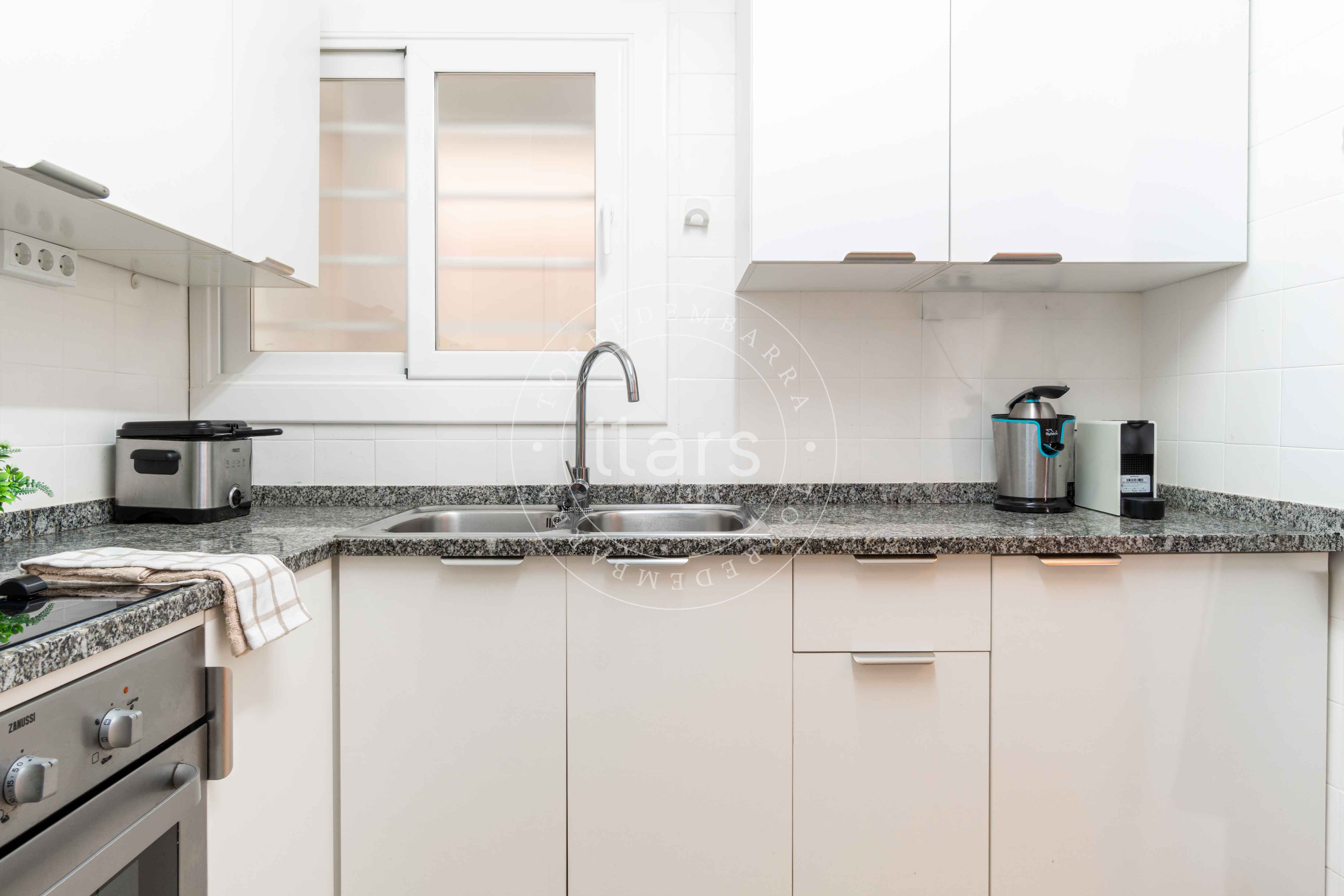 A través de un pasillo encontramos el resto de estancias: una segunda habitación doble con armario empotrado, un baño completo con plato de ducha y una cocina cuadrada totalmente equipada, práctica y funcional para el día a día.