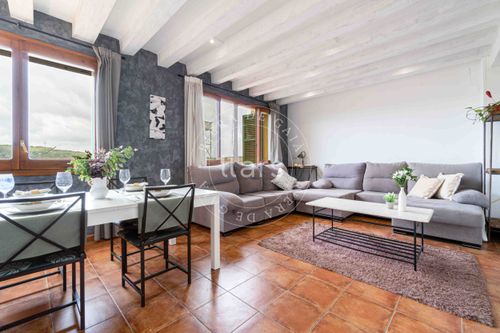 En al zona de día encontramos la cocina independiente funcional, mientras que el salón comedor, con sus amplios ventanales, ofrece un espacio cómodo y luminoso para disfrutar en familia. Todo el salón esta cubierto con bigas de madera que le dan mucha calidez a la estancia. Subiendo la escalera de caracol, llegarás al lavadero y al solárium privado de 32 metros cuadrados, un espacio exclusivo para relajarte y disfrutar del sol en total privacidad.